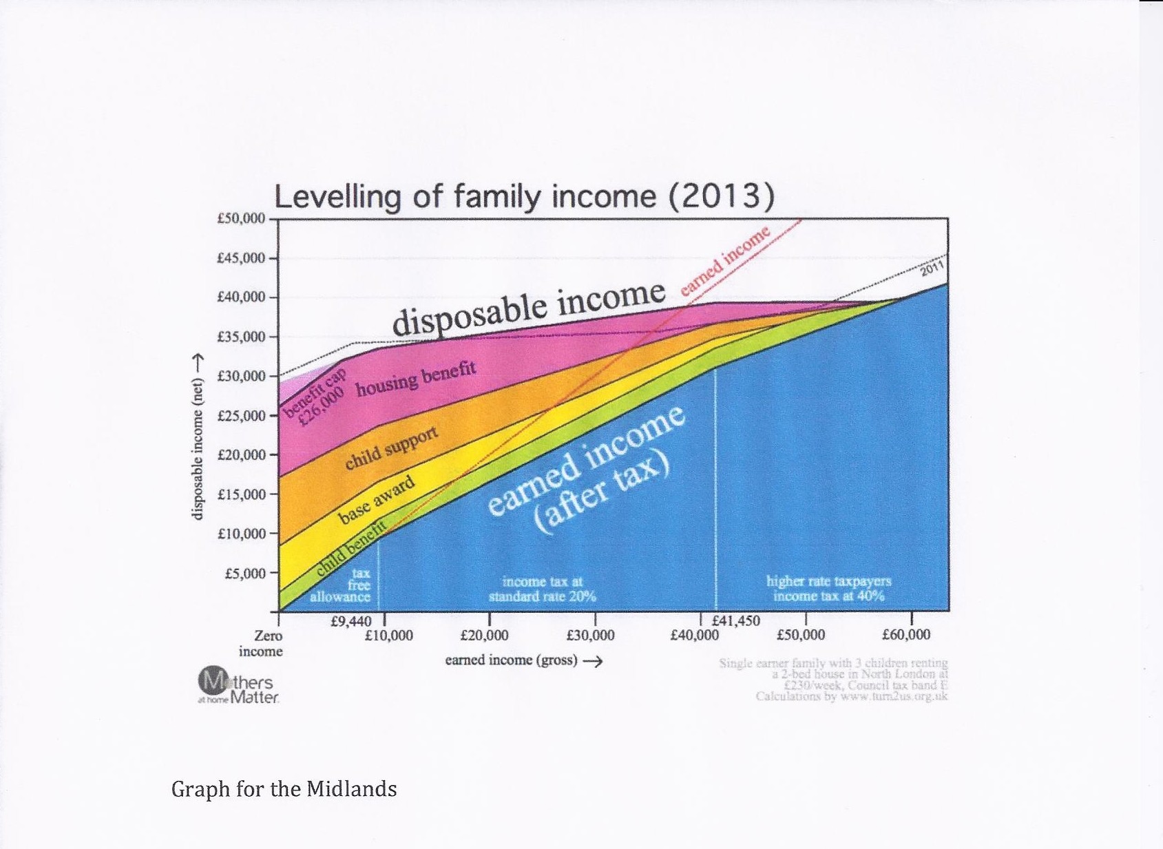 And here is a chart showing how tax credits impact on lower incomes. (Produced by “Mothers at Home Matter) The thin red line is the original Gross Income then the blue area is the income after Income Tax Indirect taxes would reduce the blue area still further.