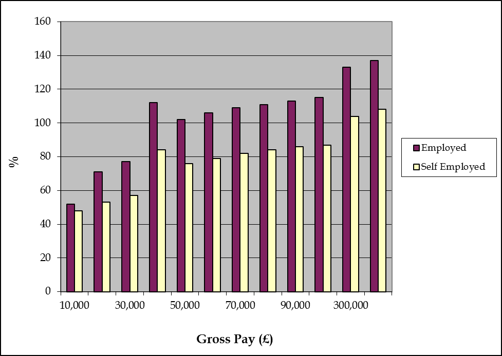 The yellow columns are the result of the same calculations for Self-Employed persons, who pay lower rates of National Insurance. However, remember they are responsible for their own Pension contributions.