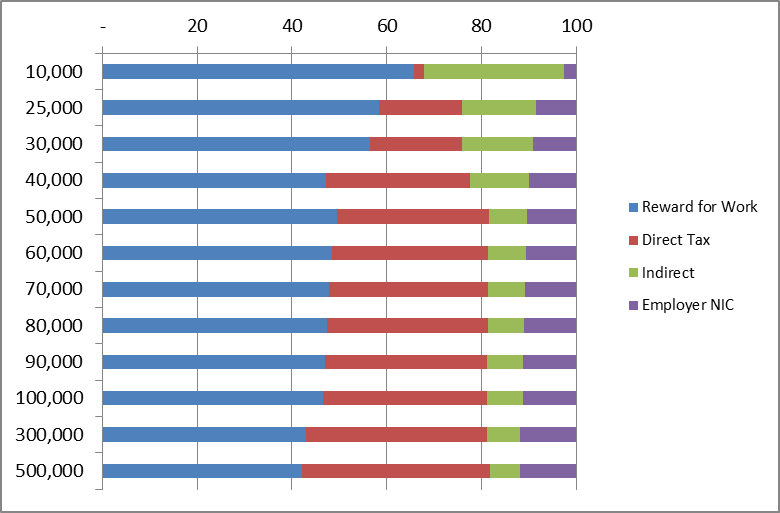 What this chart shows is the constituent parts of the cost of wages to an employer. For any given gross pay shown on the left, 100% is the employers’ cost including Employers National Insurance contributions in purple. Indirect taxes are shown in green, direct taxes, PAYE and Employees NIC in orange. The blue part is what is left to the employee to spend, excluding VAT and other indirect taxes, which we have called “reward for work”, ie take-home-pay less indirect taxes.