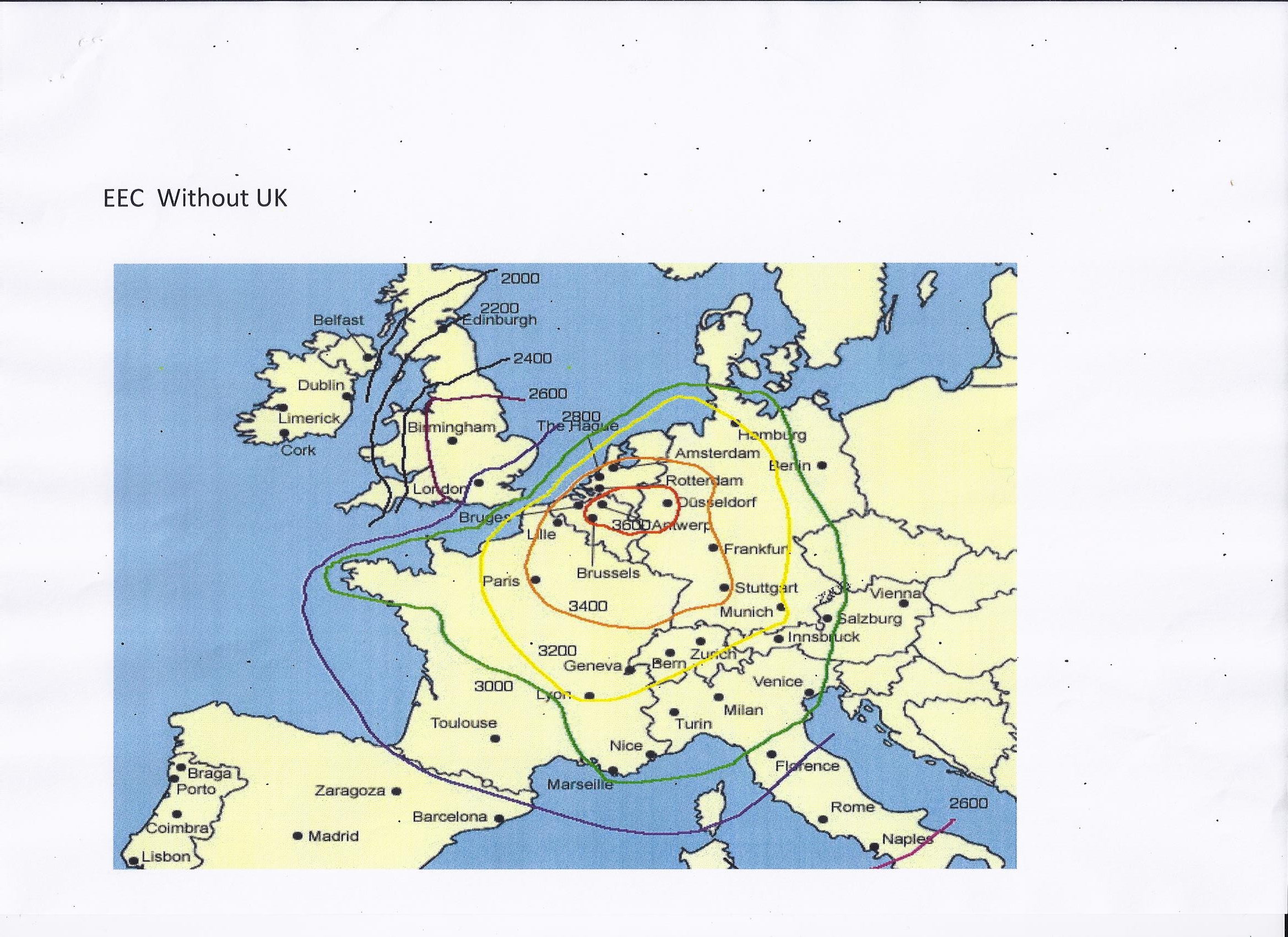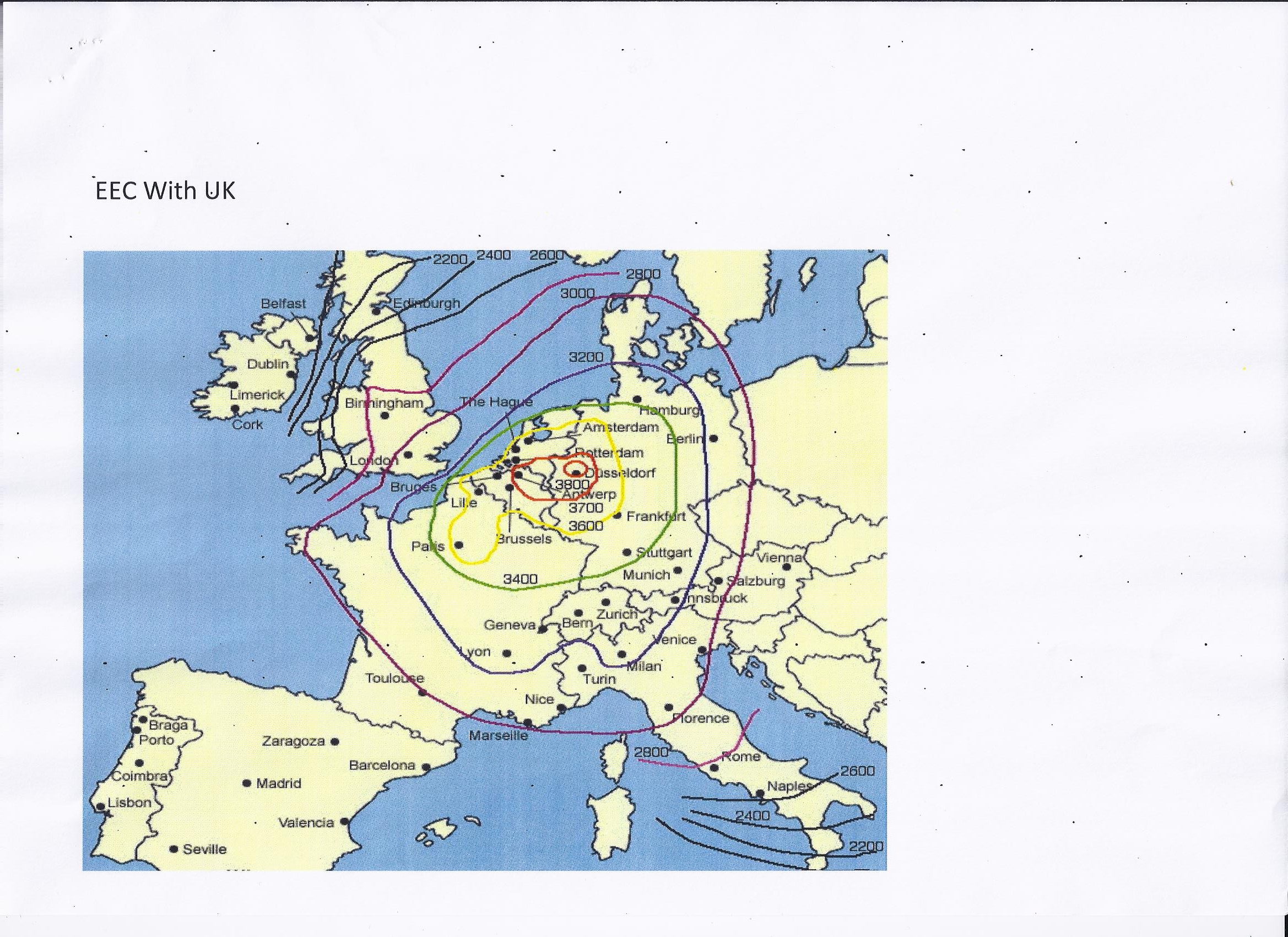 Clark considered the original 6 members of the EEC (Western Germany, France, Holland, Belgium, Italy and Luxembourg) and the UK and divided them into 103 regions. For each region the economic potential was assessed as a function of the income in that region, the transport costs to and from every other region, prevailing tariffs and a minimum cost per load due to handling and distribution. A 10-ton load was the unit distributed and a minimum cost was added in for handling and distribution irrespective of distance travelled. Road, rail and sea transport were included but not the use of canals, and finally an allowance made for trade with other European nations and the rest of the world. The economic potentials calculated were rounded to a 200 unit spacing and lines of equal potential joined to form Isotims and drawn on a map of Europe.